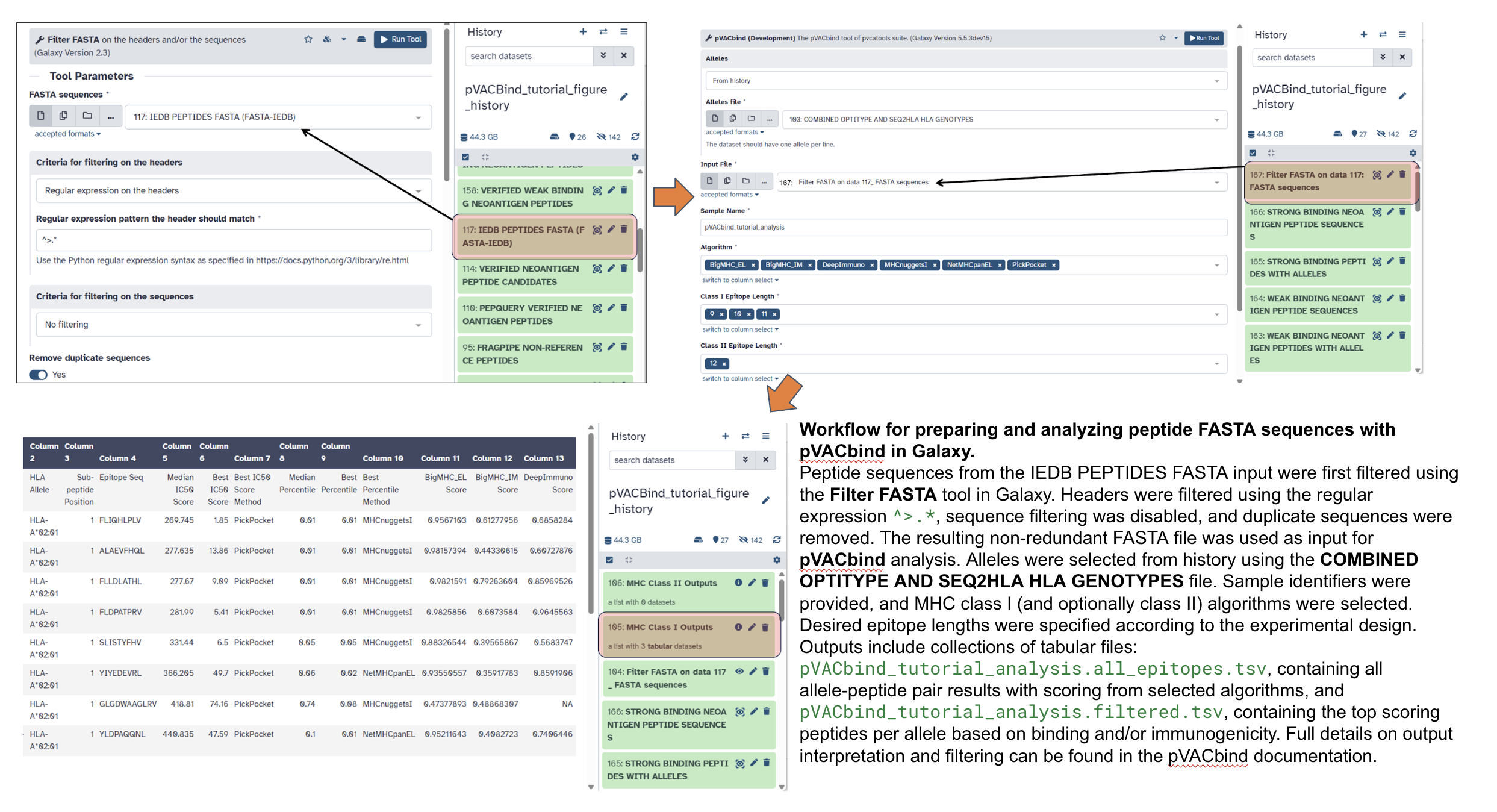The outputs from the iPepGen workflow, specifically the HLA allele genotypes and verified neoantigen candidate peptide sequences, serve as input to the pVACbind software suite, which we deployed as a Galaxy tool. pVACbind is part of the personalized Variant Antigens in Cancer tool suite (pVACtools). The pVACbind software bundles numerous complementary tools for predicting binding of input peptide sequences to HLA protein complexes (both class I and II) coded by specific allele genotypes, as well as two deep learning algorithms, DeepImmuno and BigMHC, for predicting immunogenicity of HLA alleles and bound peptides. The Galaxy tool outputs a tabular file with aggregated results across all of the algorithms selected by the user, as well as a filtered output showing only those peptide and allele combination scores indicating high potential for immunogenicity. The (pVACbind)[https://pvactools.readthedocs.io/en/latest/pvacbind.html] software is well documented and provides users with ample information about the bundled tools and how to interpret results for assisting in prioritizing peptides for further experimental testing as immunotherapy agents.